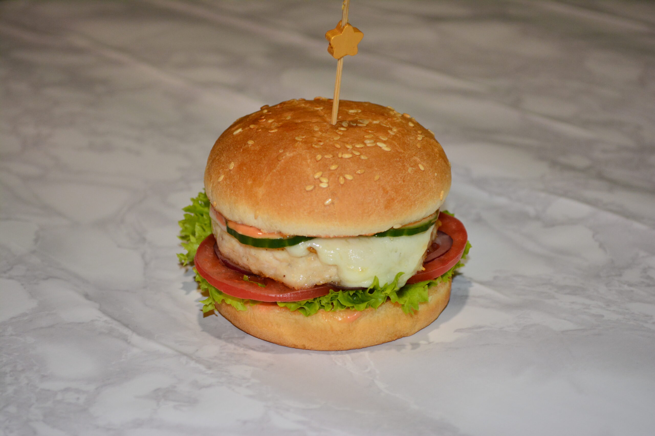 Булочка, котлета куриная, сыр чеддер, помидоры, огурцы, лист салата, лук красный, соус фирменный