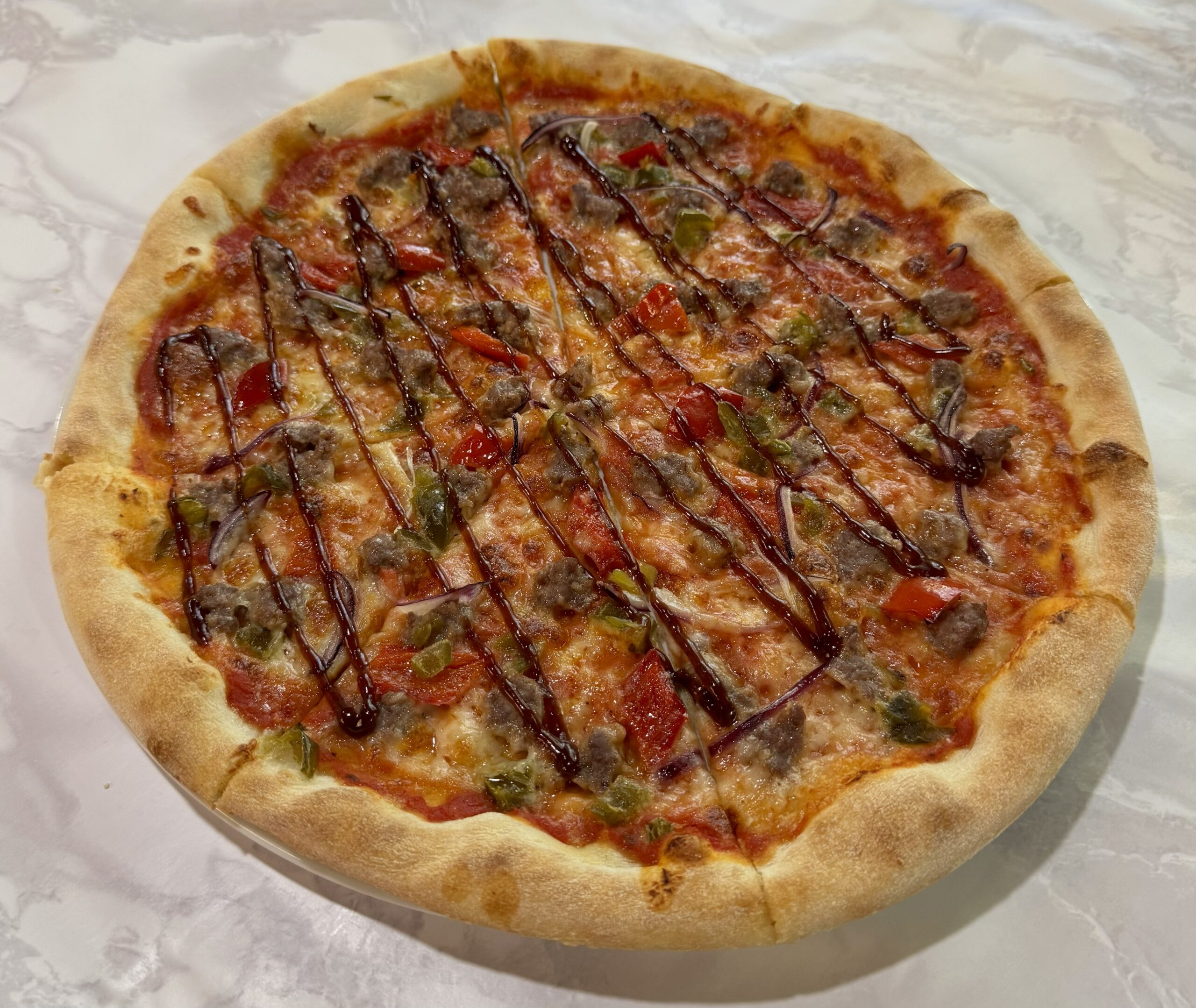 Фарш курино-говяжий, сыр «Моцарелла», халапеньо, соус красный, перец печенный, соус барбекю , лук красный.