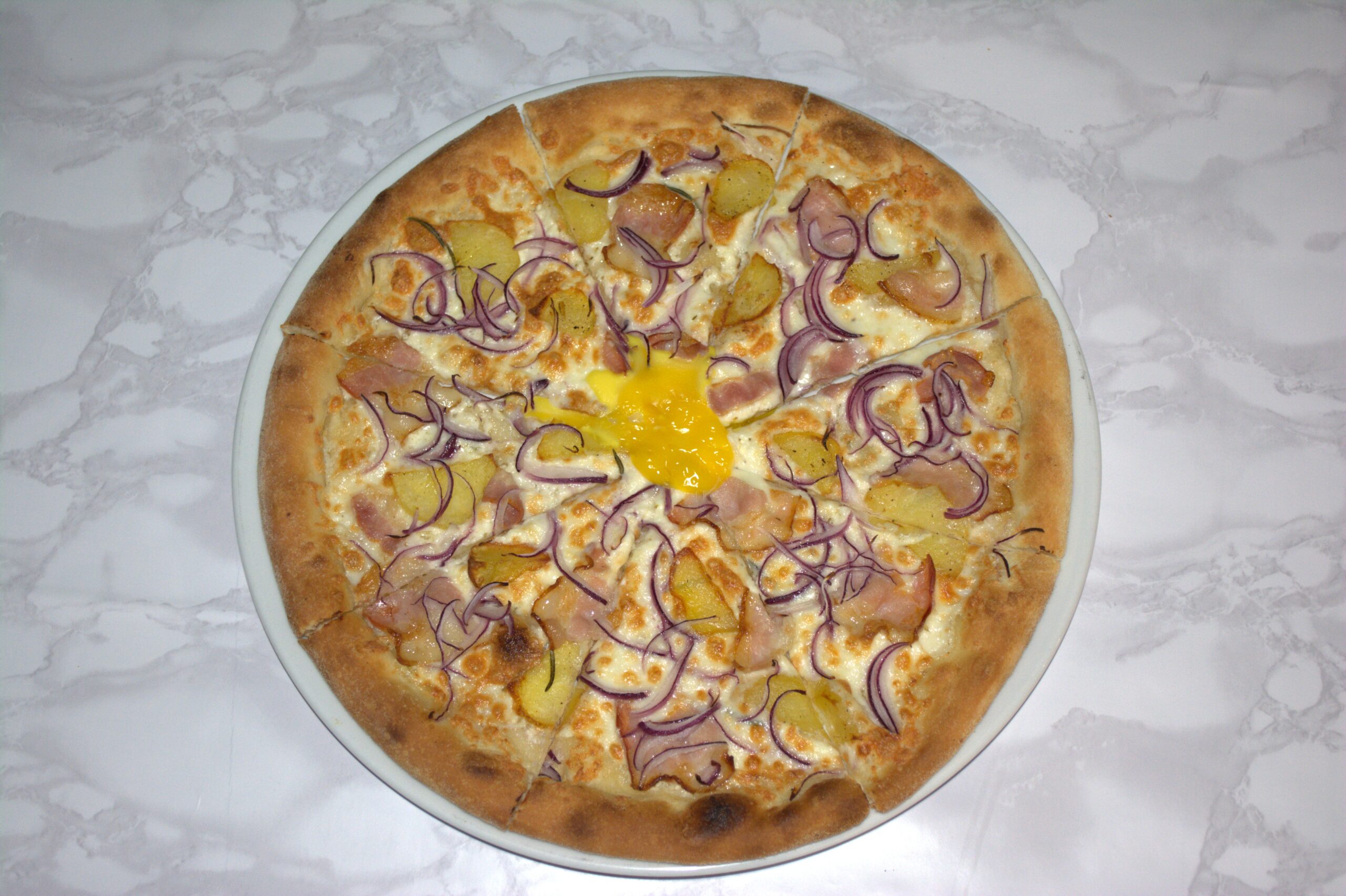 Сыр моцарелла, бекон, картофель запеченный, соус сливочный, яйцо куриное, лук красный