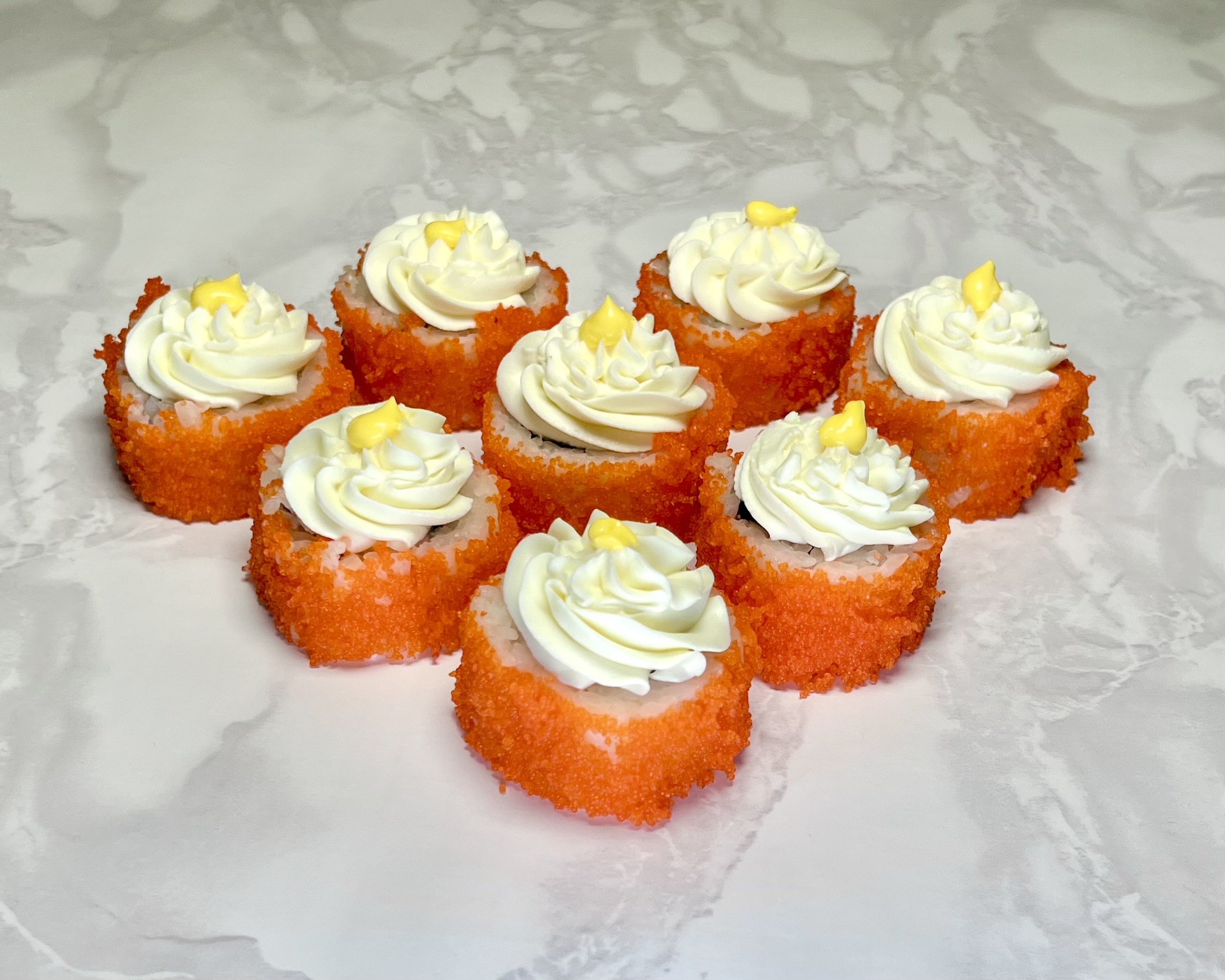 Рис, нори, креветка, сыр сливочный, сырный соус, огурец, снежный краб, соус яки, икра масаго