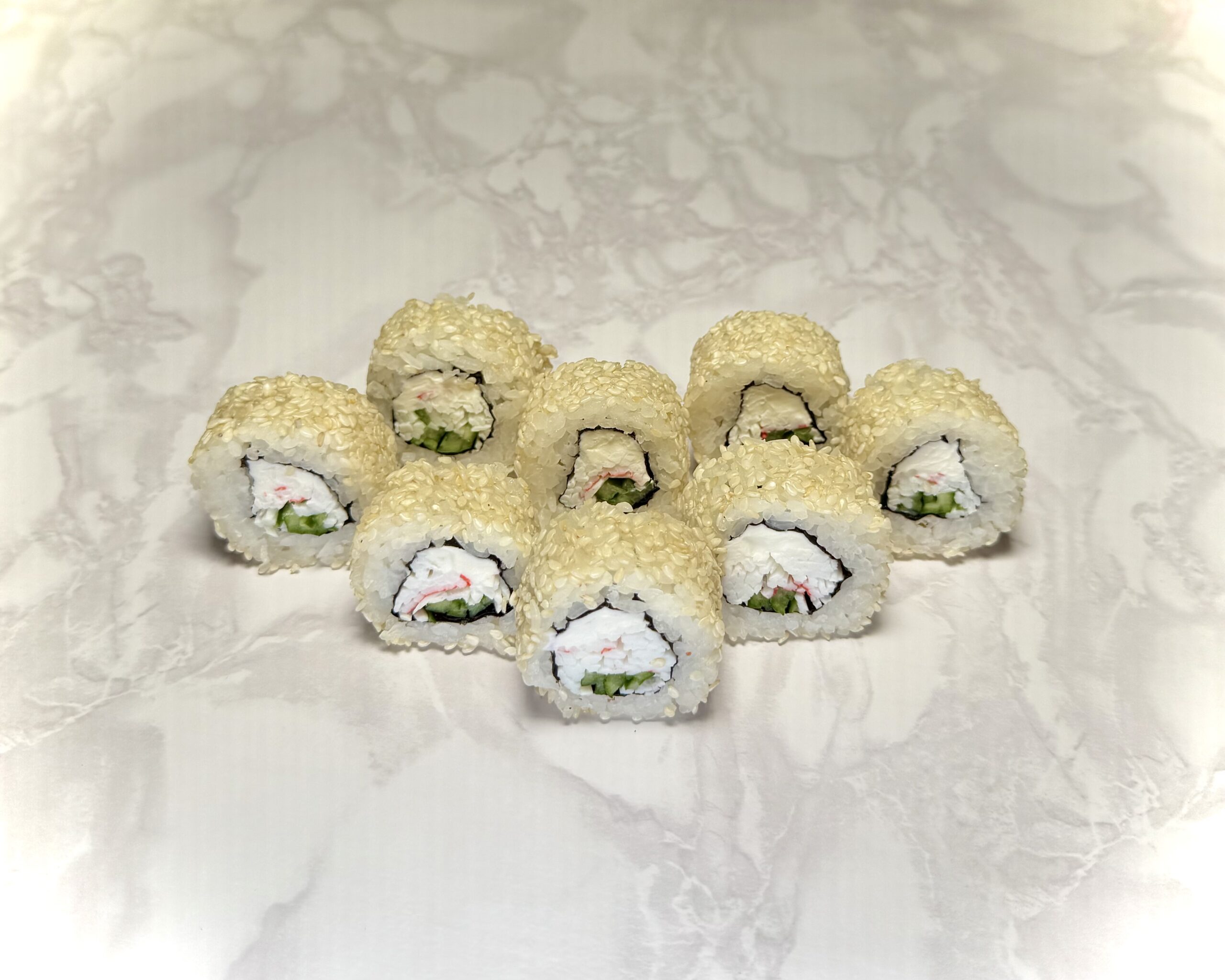 Рис, нори, снежный краб, сыр сливочный, огурец, кунжут