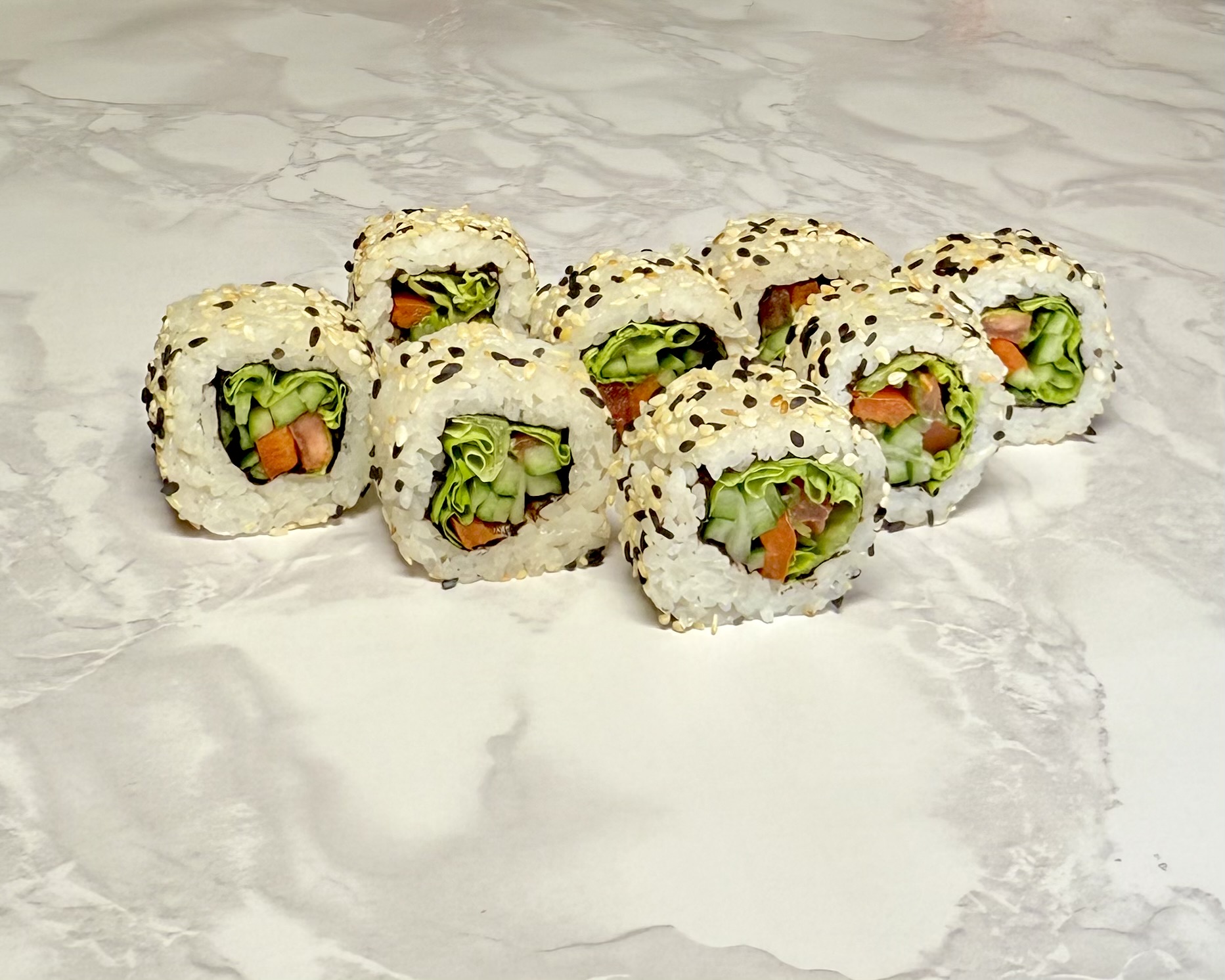 Рис, нори, салат айсберг, огурцы, перец болгарский, кунжут