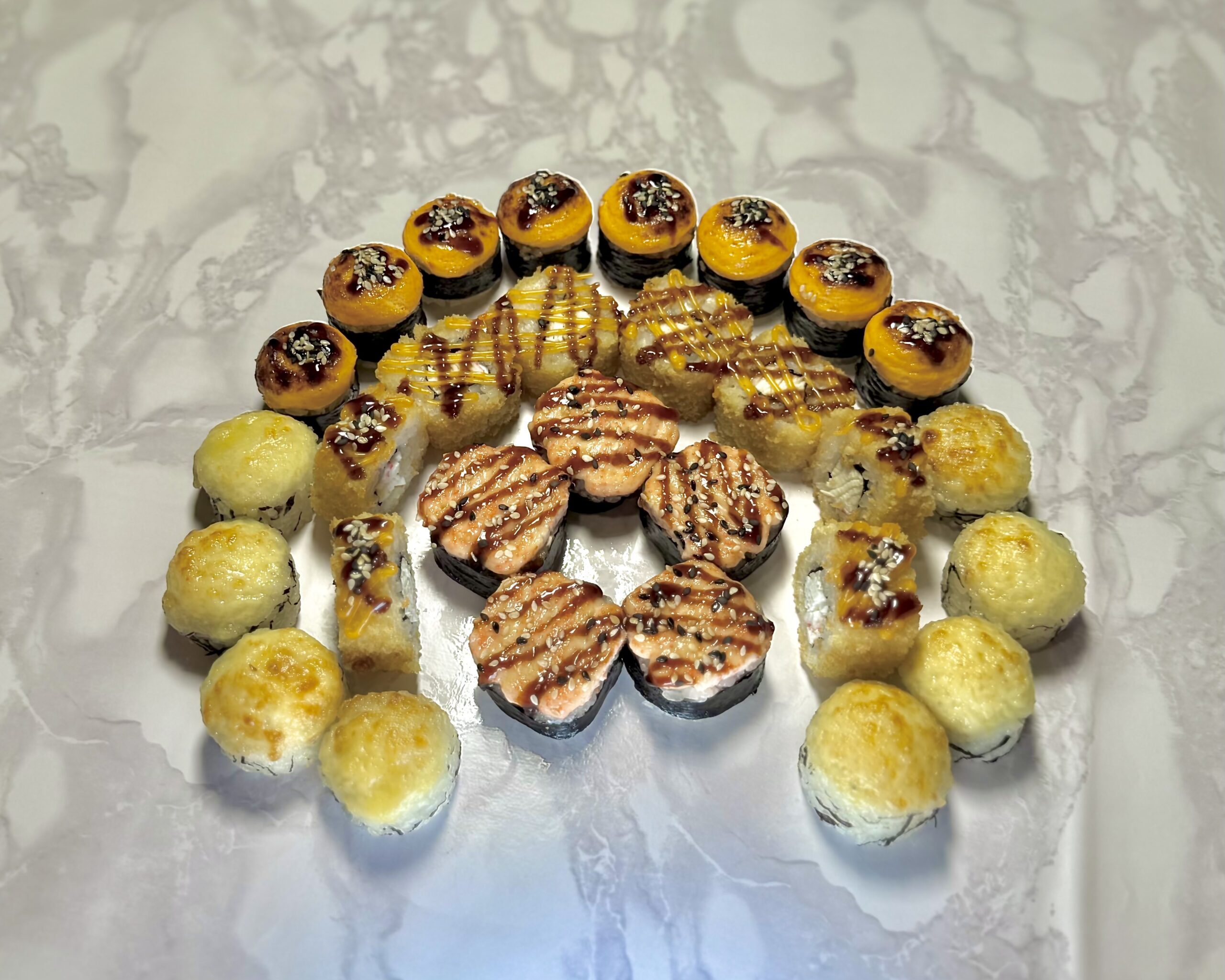 Ролл камикадзе, ролл жареный краб с лососем, ролл биг спайси, ролл сырный с ветчиной
