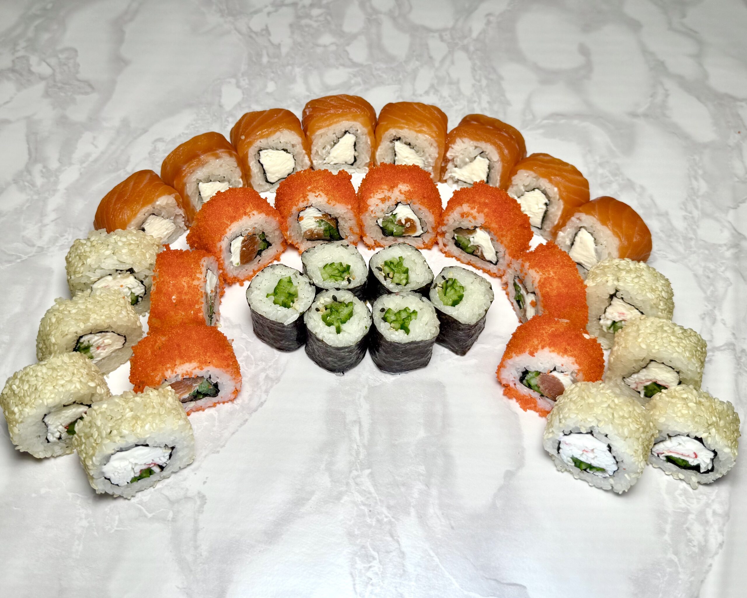 Филадельфия классическая, Калифорния с креветкой, Калифорния в кунжуте, Ролл с огурцом